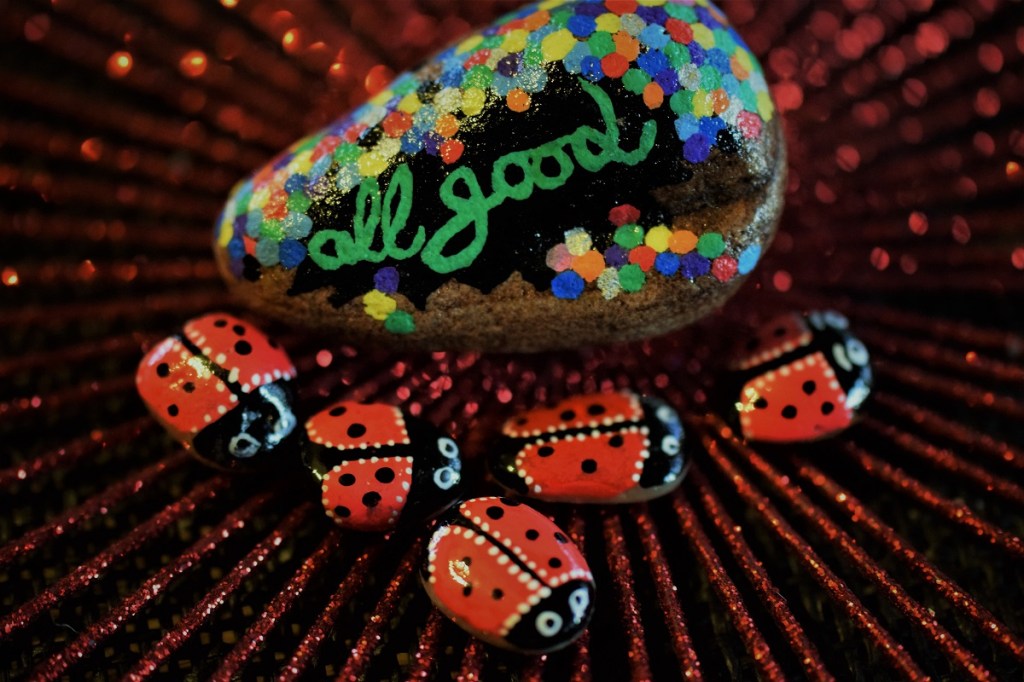 Hi Joe! Ich hatte am Strand kleine Steine (kleiner als ein Cent Stück gesammelt). Eigentlich wollte ich die auf Papier kleben, jetzt sind sie aber den Acrylstiften zum Opfer gefallen und tragen ein rotes Kleid mit schwarzen Punkten. Ich habe viele kleine Lady Bugs gemalt, die lassen sich so schön verschenken…