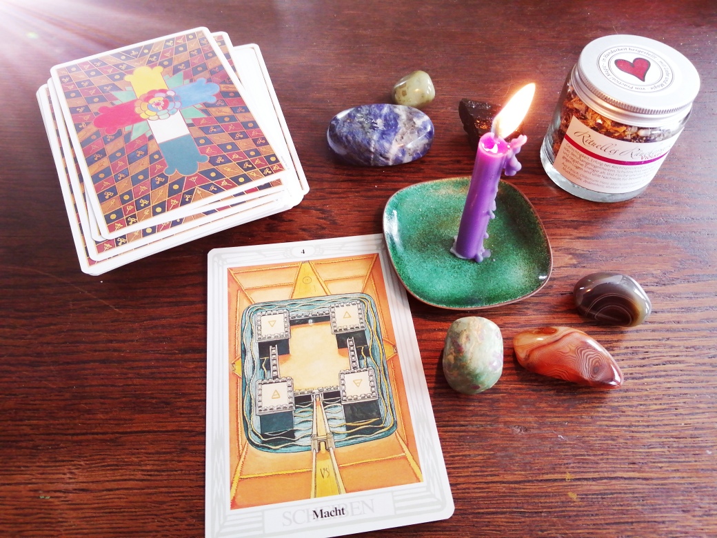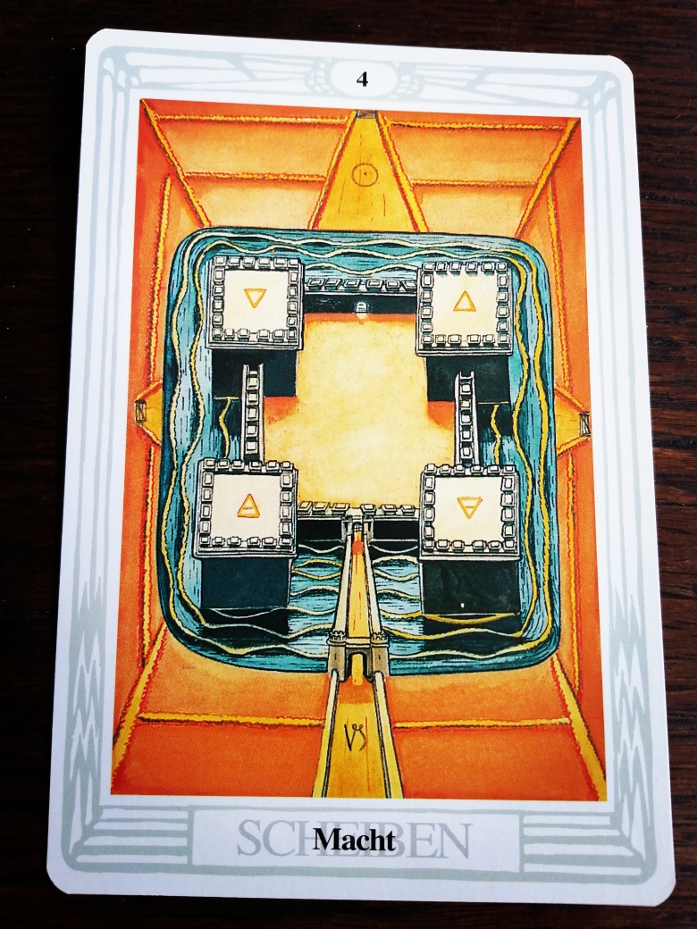 Abschließend wählte ich Aleister Cowleys Thoth Tarot Deck und zog die folgende Karte: 4 Scheiben “Macht”