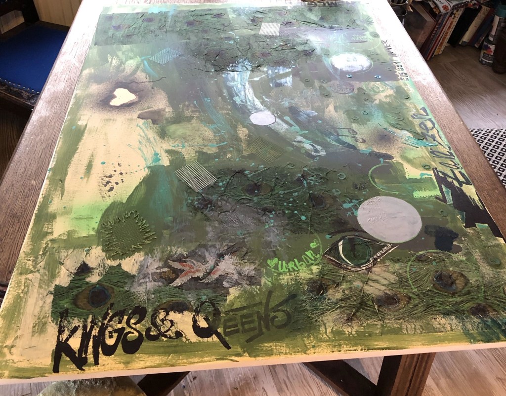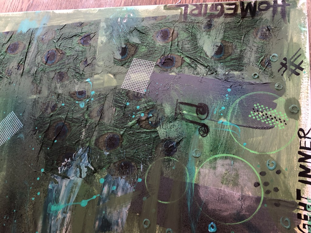 Also begann ich am TAG 1 mit Grün-, Grau- und Sandfarben. Ich fügte Struktur hinzu, indem ich Servietten mit Pfauen- und Kranichmuster einbezog. Es ist nur der Anfang und der erste kleine Babyschritt.